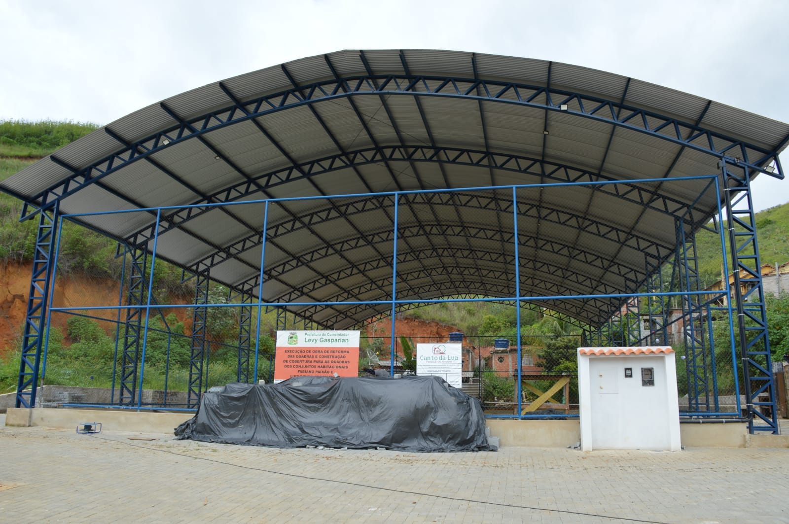 A Prefeitura de Levy Gasparian continua com a obra de reforma e cobertura da quadra do Conjunto Habitacional Fabiano Paixão. Em fase final e com a cobertura da quadra concluída, os profissionais trabalham na parte externa do local.