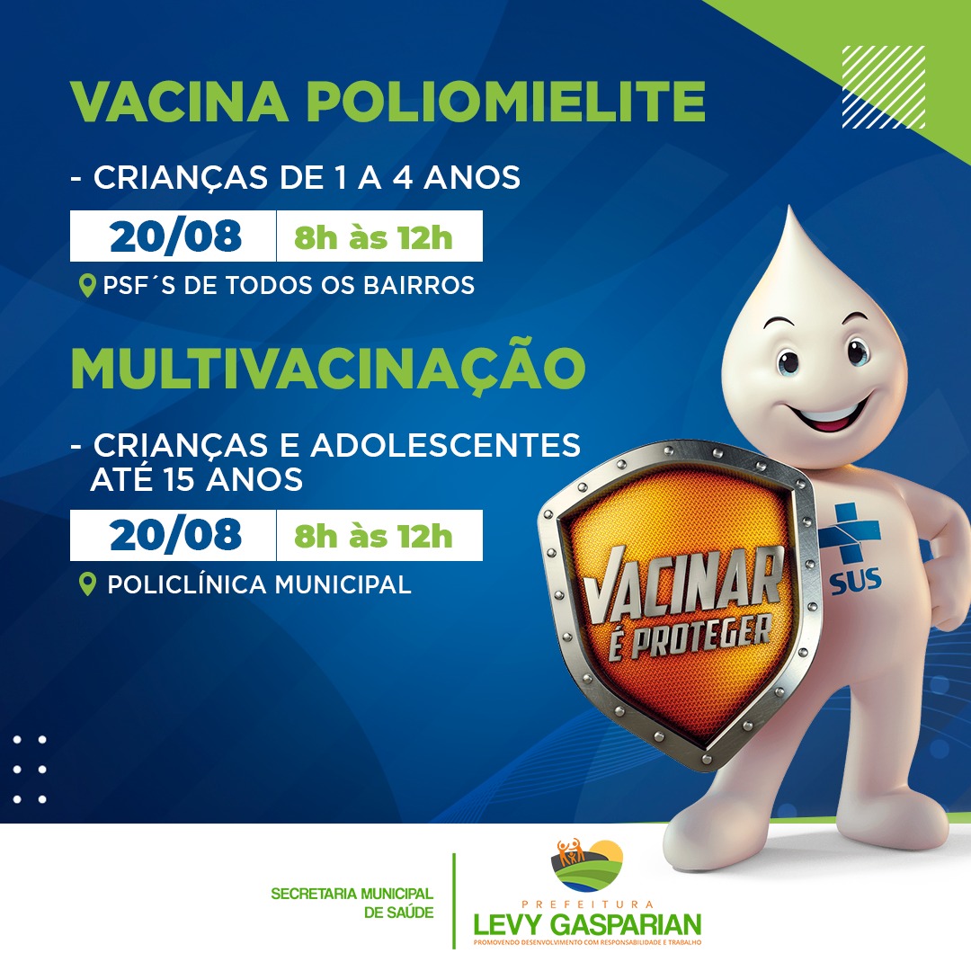 Em Levy Gasparian, a vacinação ocorrerá em todos os PSF´s, que funcionarão das 8h às 12h, recebendo crianças de 1 a 4 anos para realização da vacina contra poliomielite. Também estarão disponíveis doses contra a gripe.